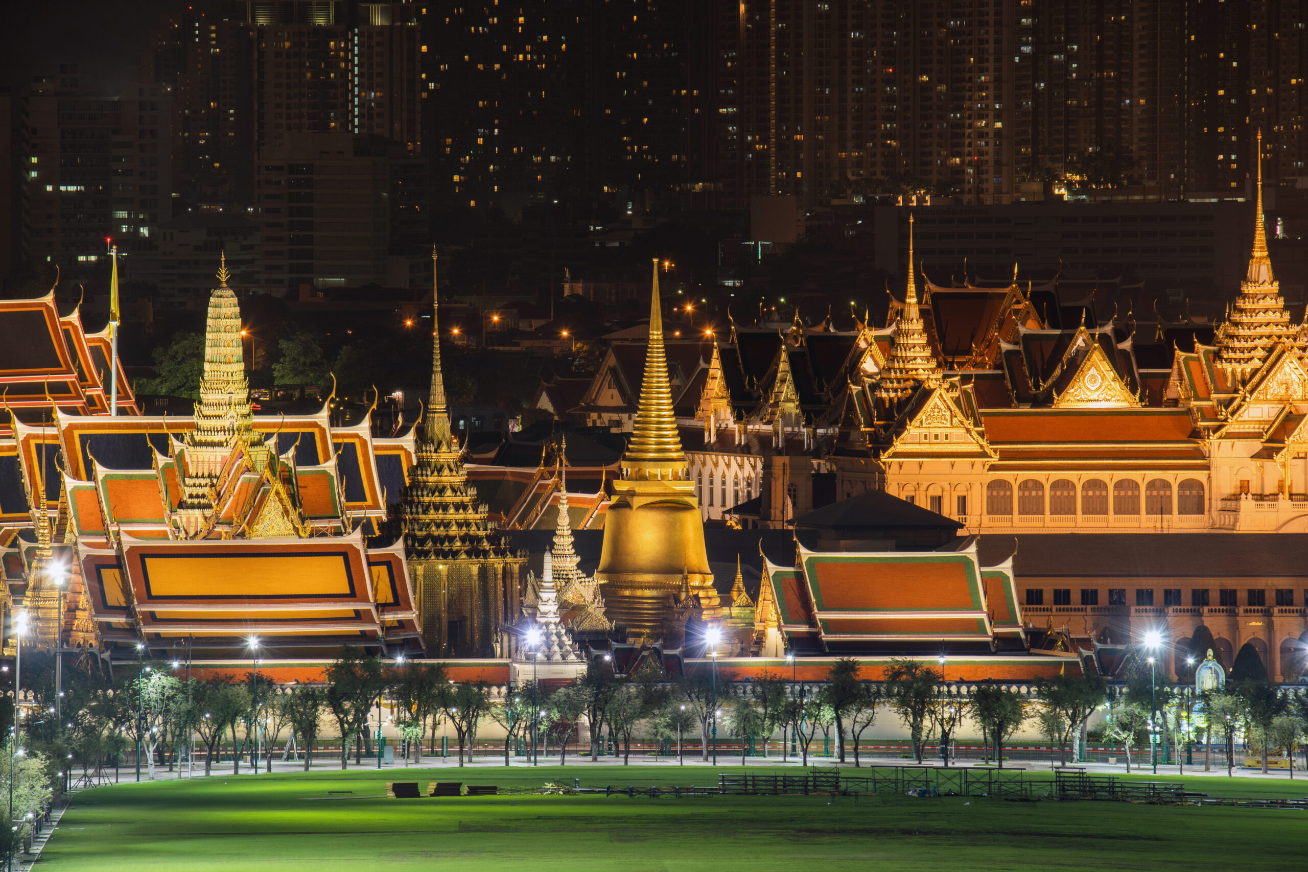 Temple of the Emerald Buddha, Grand palace, Wat Pho, Temple of Dawn, and Sanam Luang, Wat Phra Kaew, and skyscraper buildings. Bangkok City in downtown area at night, Thailand. Buddhist temple.