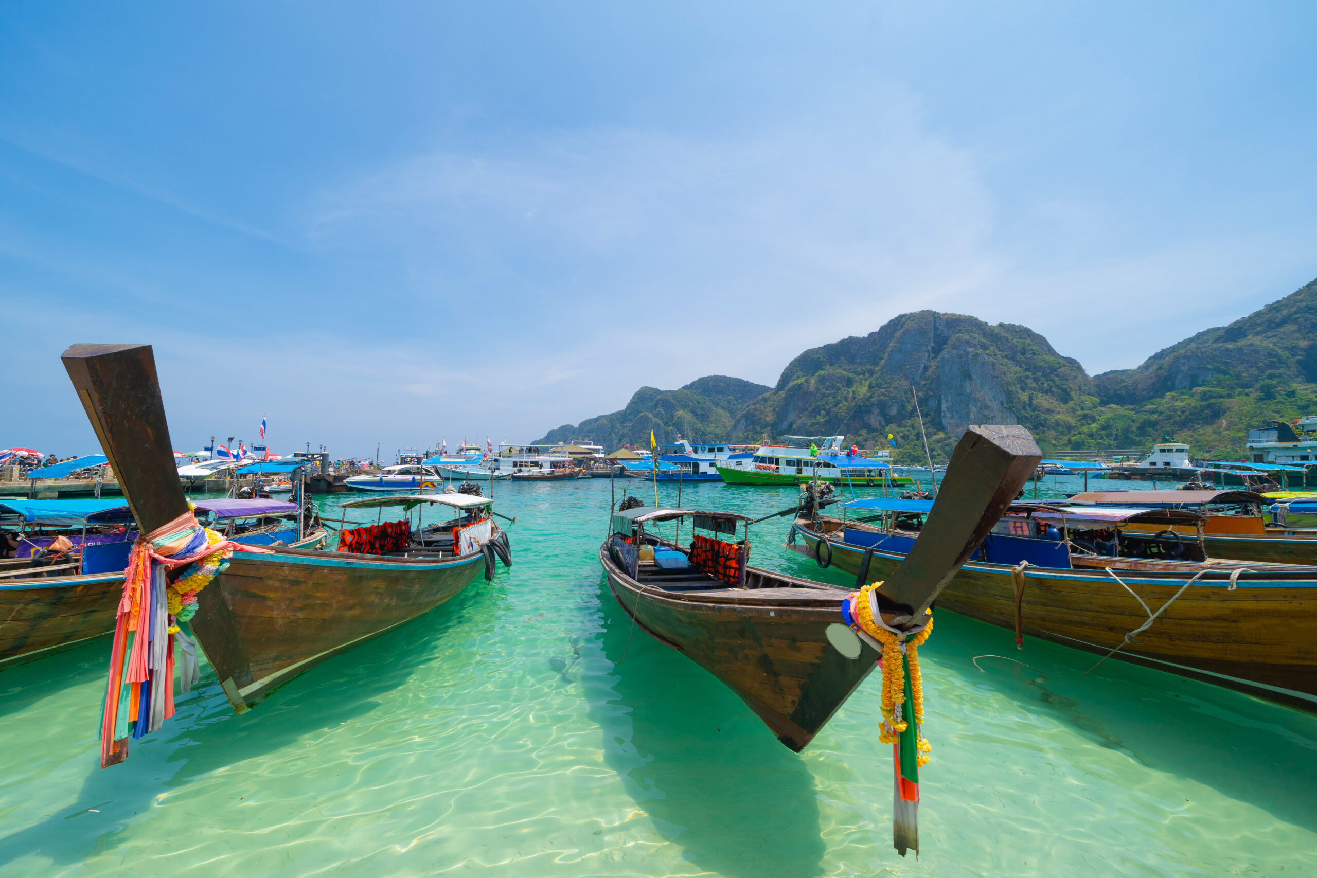 Boats in Phi Phi, Maya beach with blue turquoise seawater, Phuket island in summer season in travel holiday vacation trip. Andaman ocean, Thailand. Tourist attraction with blue sky. Nature landscape.